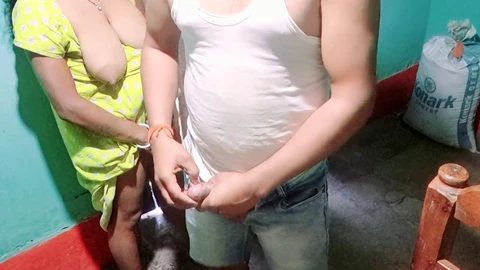 Sweet roomie gives handjob in cozy sweater and receives a cumshot